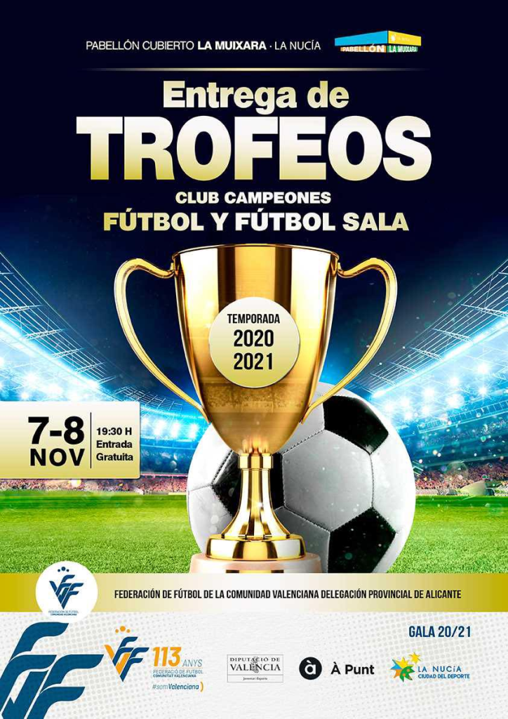 La Gala de Entrega de Trofeos de la Provincia de Alicante de la Federación de Fútbol de la Comunidad Valenciana (#PremiosFFCVLaNucia) 2020-201 se celebra hoy y mañana en el Pabellón Muixara de “La Nucía, Ciudad del Deporte”. Hoy lunes 7 de noviembre a las 19,30 se entregarán 102 trofeos a los equipos campeones desde prebenjamines hasta infantiles de Fútbol, Fútbol Sala y Fútbol Femenino y mañana martes otros 59 trofeos, desde cadetes hasta regional. Entre las dos jornadas se premiará a 7 equipos nucieros del C.F. La Nucía, que quedaron campeones.
