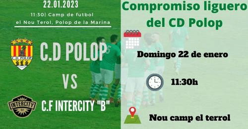 El CD Polop prepara la visita del CF Intercity B aquest diumenge 22 de gener a les 11.30h. Esperem que els nostres jugadors aconseguisquen un bon resultat.