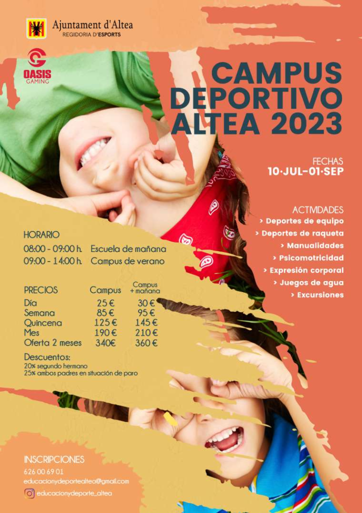 Las inscripciones se pueden realizar desde hoy mismo llamando a los teléfonos 626 00 69 01 o escribiendo un mail a educacionydeportealtea@gmail.com. También se podrán realizas las inscripciones de forma física en el Centro Juvenil.