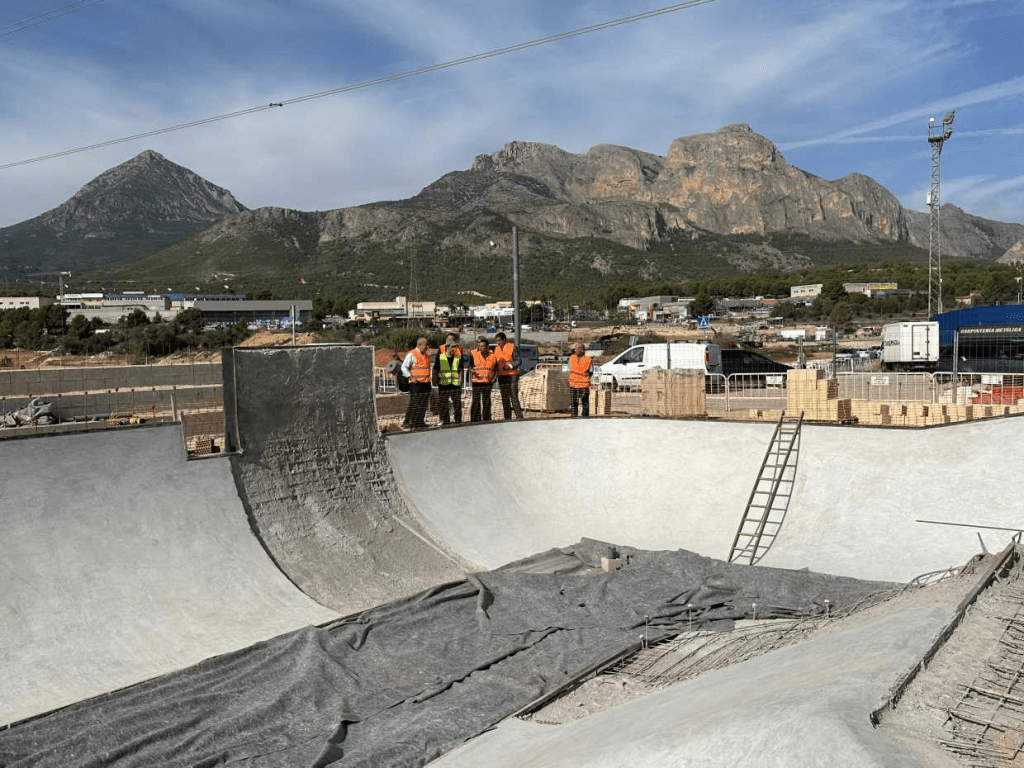En la visita a las obras del nuevo Skatepark de La Nucía participaron Carmelo Paniagua, presidente de la Real Federación Española de Patinaje (RFEP), Francesc Gil, Director Deportivo RFEP Daniel Yábar, arquitecto-redactor del proyecto, Javier Trigo, director del Centro de Estudios Olímpicos de La Nucía, Pablo Sánchez, pte. Club Skate La Nucía, Sergio Villalba concejal de Deportes y Bernabé Cano, alcalde de La Nucía.