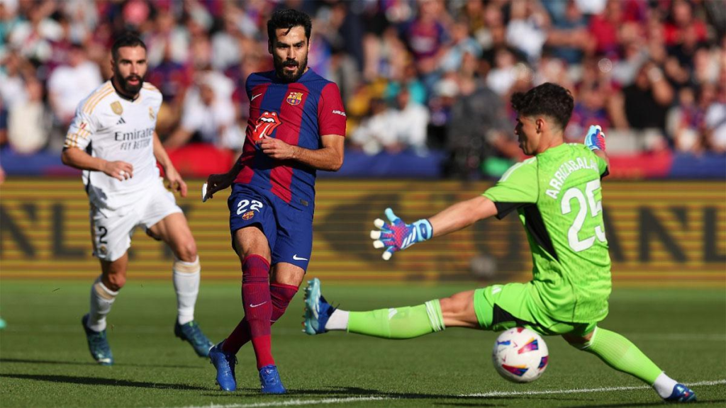 Manolo Mora.- El Real Madrid que venía con una ventaja de un punto sobre el Barça en la clasificación disputaba este partido, con una primera parte de total dominio del Barça, que se adelantaba en el minuto 6 con gol de Gundogan, con un Gavi indomable que secó a Bellingham en este primer round del partido.