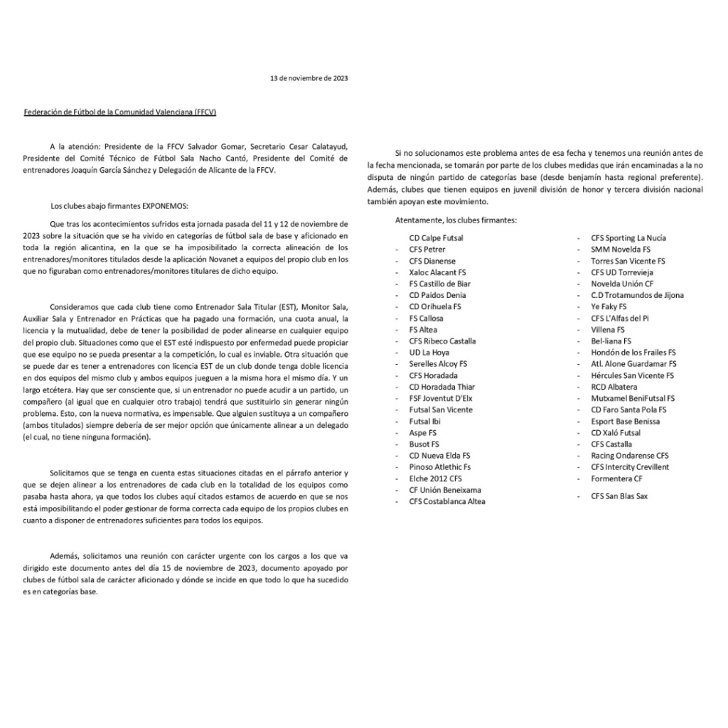 Ante la nueva normativa que afecta a nuestros entrenadores y equipos, aplicada desde el 9/11/23, reclamamos a FFCV una solución y una reunión con carácter urgente para tratar otros temas como la falta de Seleeción Valenciana Benjamín la atención a deportistas y clubes, y otros muchos aspectos que nos afectan diariamente.