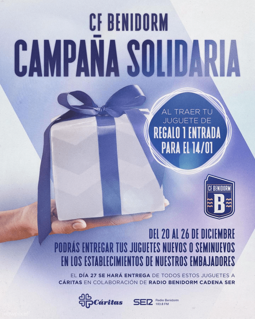 El CF Benidorm se une a la campaña organizada por Cáritas y Cadena SER Benidorm, y con cada juguete que traigas, una invitación para el partido frente al UD Calpe el 14 de enero.