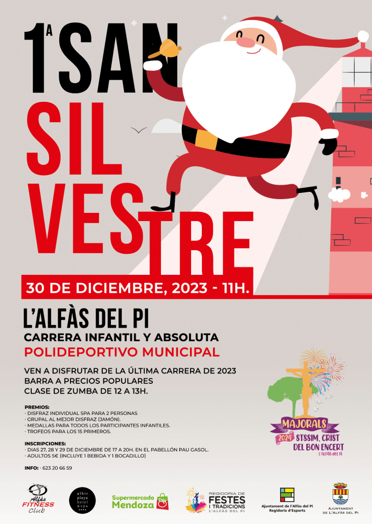 La primera San Silvestre de l’Alfàs se disputará el sábado 30 de diciembre, a las 11 horas. Tanto la salida como la llegada a meta en la modalidad de adultos se realizará desde la pista de atletismo. El recorrido, de 4 kilómetros de distancia, transcurrirá por las inmediaciones del polideportivo municipal.