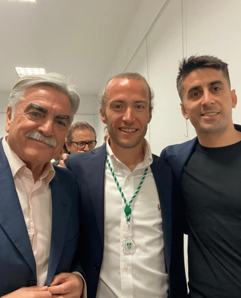 Aquí con tres futbolistas, tres amigos, tres personas que, cada una en su medida, me ayudaron a ser mejor en mi profesión y a valorar lo importante que pueden llegar a ser el respeto mutuo y la lealtad. Fernando Campos, Antonio del Moral y Pedro Sánchez