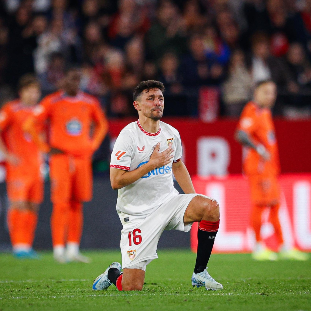 Jesús Navas hinca la rodilla para agradecer el reconocimiento a su afición, que ya vio todo el partido rodilla en tierra en señal de agradecimiento y respeto al ídolo